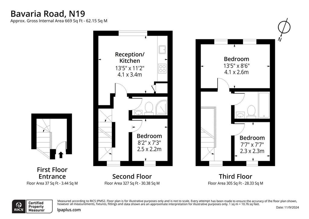 It is a split level flat, with a kitchen/diner, bathroom and a bedroom occupying the second floor, and 2 bedrooms and a bathroom with a shower occupying the third floor.