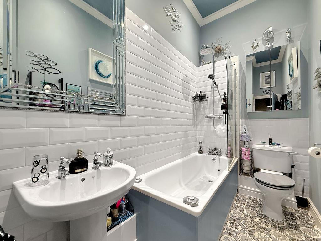 On the first floor you will find two bedrooms and the family bathroom. You will also find polished wooden flooring through both bedrooms. Both bedrooms include fitted wardrobes and sash windows and in bedroom one you will find a built in blanket box for extra storage. There is loft access in bedroom two. The sizeable loft could be subject to further investigations and consents for a potential conversion of that space.