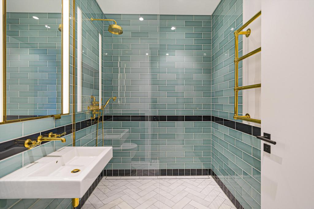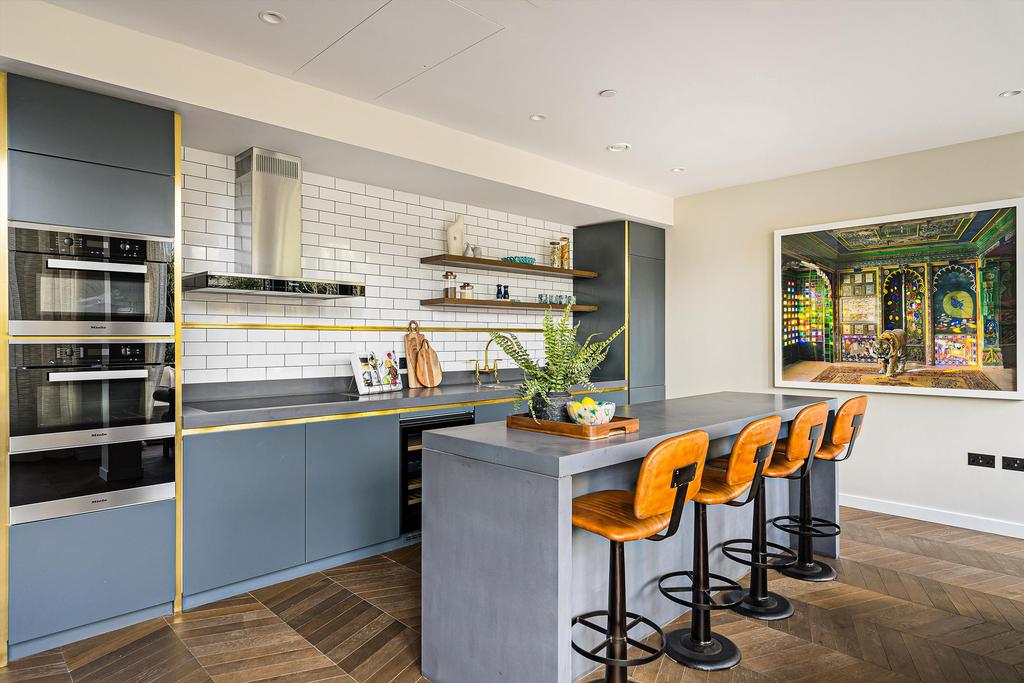 The three bedrooms are found off the reception room, with floor-to-ceiling windows allowing natural light to fill the rooms. The principal bedroom suite has a dressing area, a sumptuous bathroom with twin sinks, a free-standing copper bathtub, and a separate shower. The two further bedrooms have generous fitted wardrobes and en suite shower rooms with stunning fixtures and fittings.