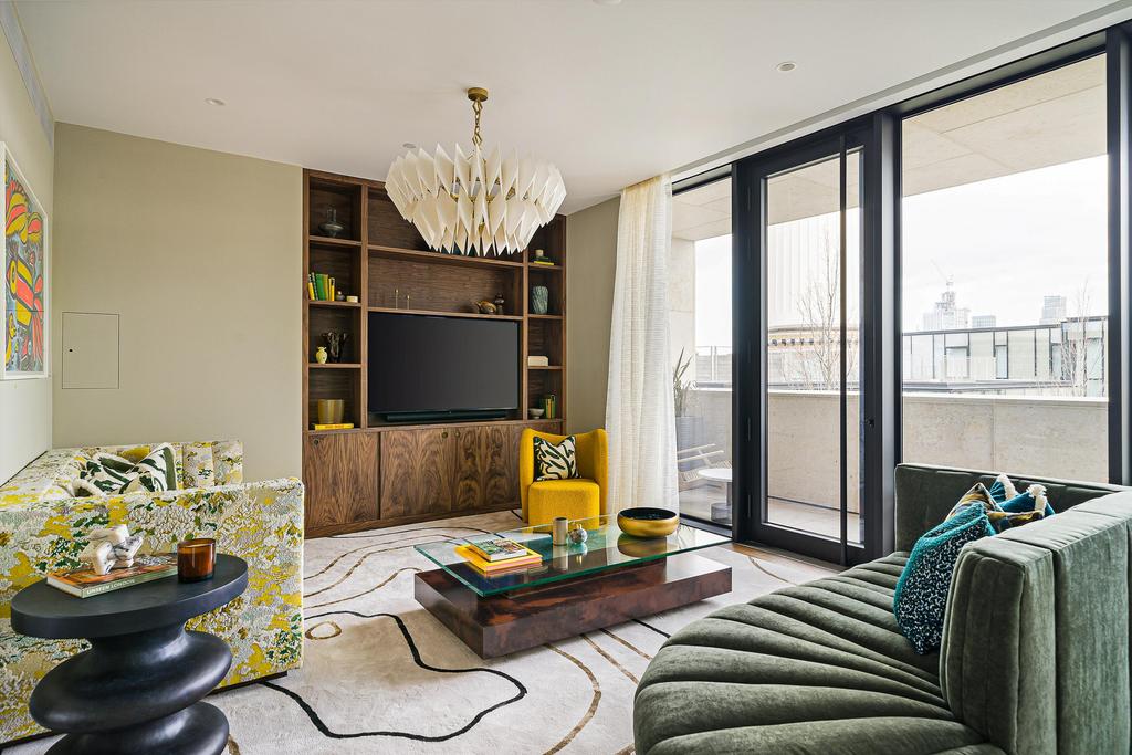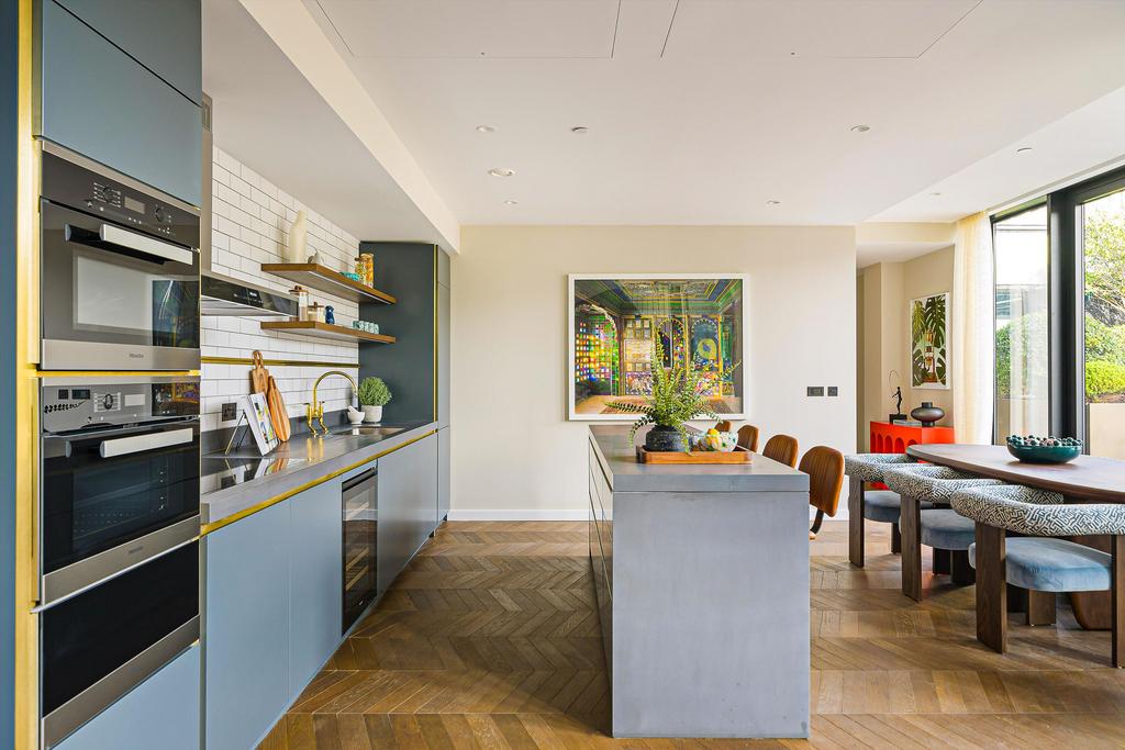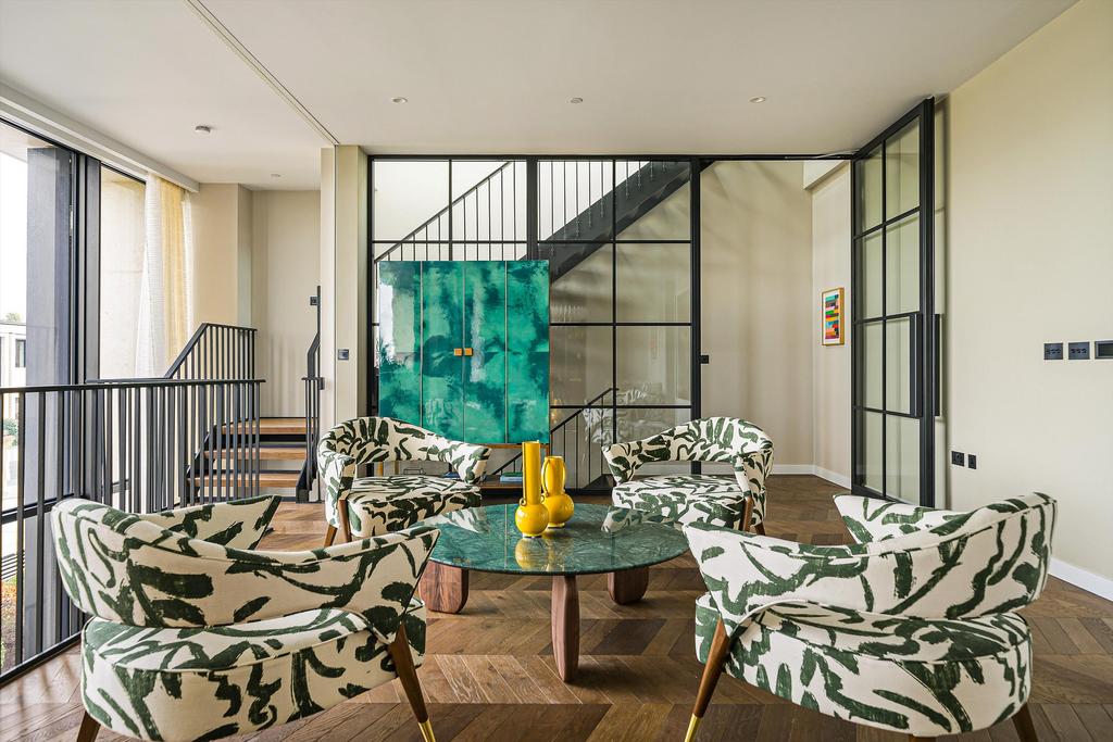 Found on the eleventh, twelfth and thirteenth floors, this penthouse has private lift access into the apartment, private parking for two cars (one with an electric car charging unit) and ample outside space with unrivaled views of the River Thames and over London. This Sky Villa penthouse is a phenomenal space within this exclusive residence with interior design by Georgina Murphy interiors.