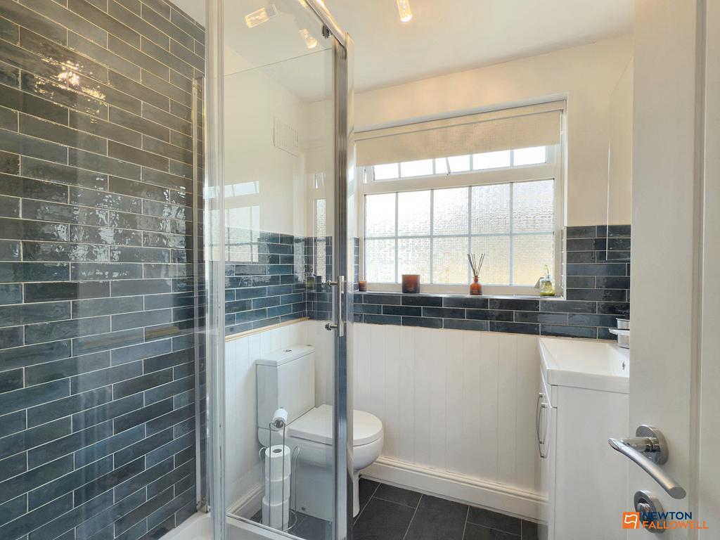 • Stylish Downstairs Bathroom: The re-fitted bathroom exudes sophistication, featuring a shower cubicle with shower, a wash basin with vanity unit, WC, feature radiator, and complementary tiling. A double-glazed frosted window to the rear ensures privacy and natural light.