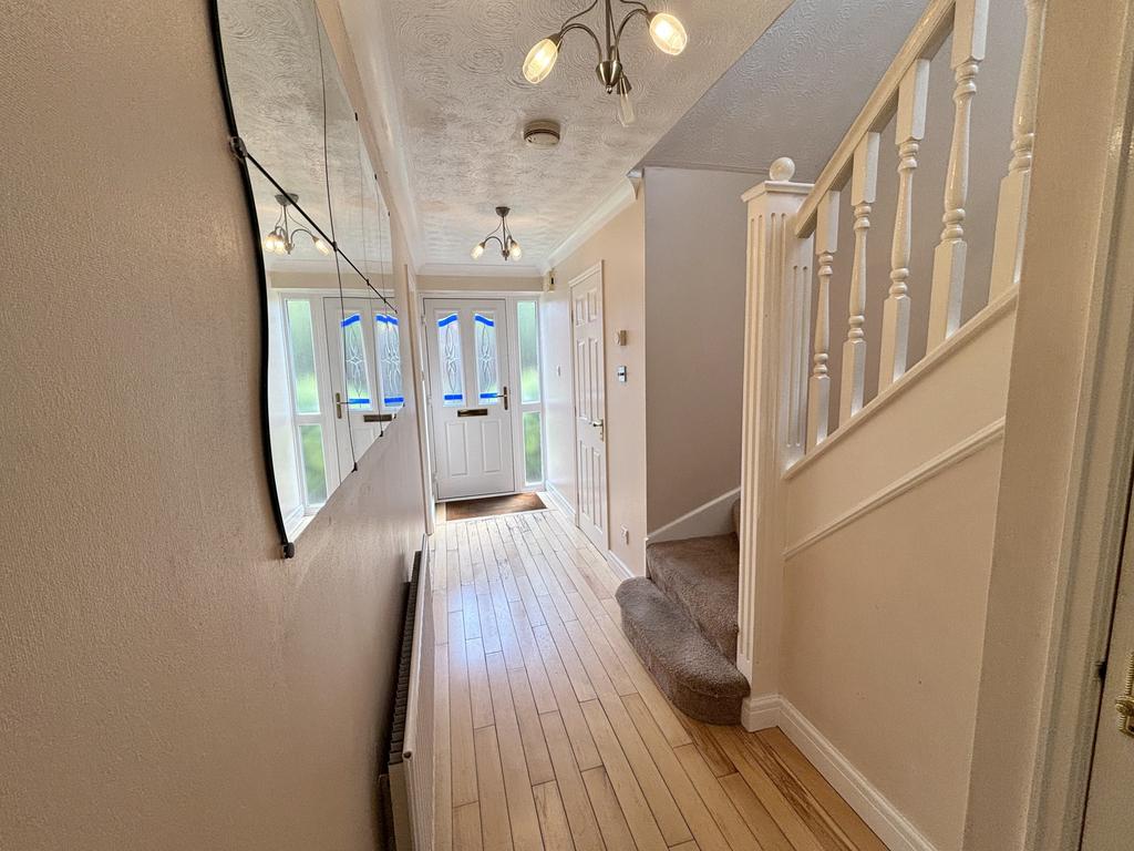 UPVC double glazed door to the front aspect, radiator, stairs to the first floor, wood flooring, under the stairs storage and coved ceiling.