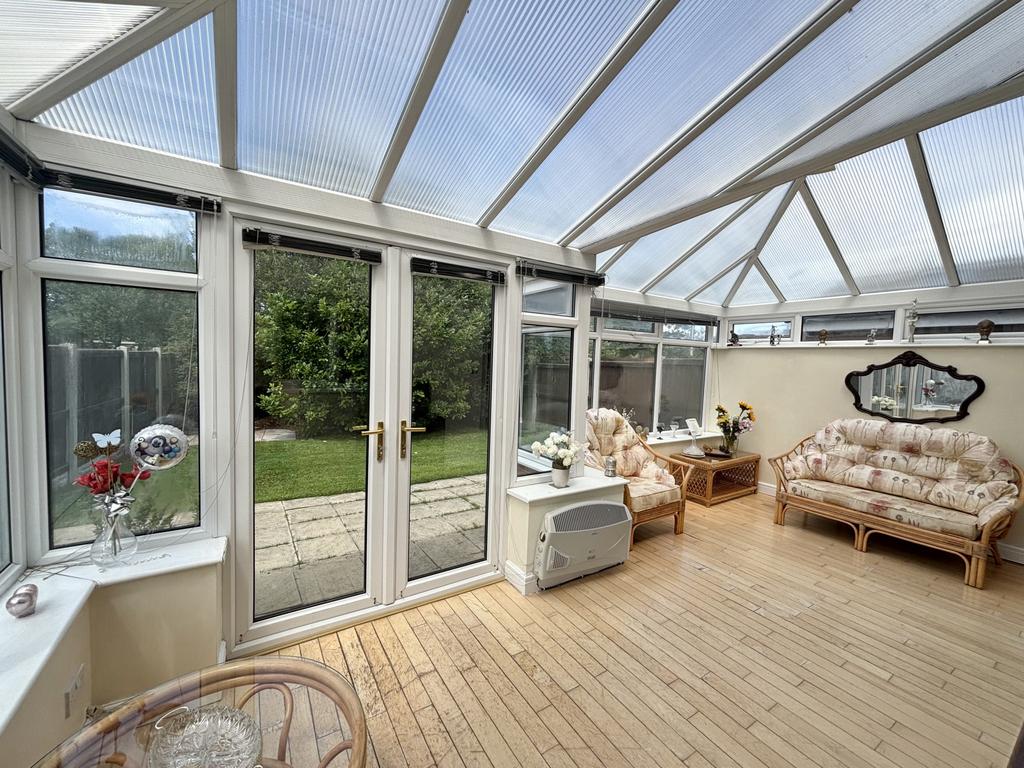 UPVC double glazed patio doors leading into the garden, UPVC double glazed windows to the side and rear aspect, wood flooring and wall mounted heater.