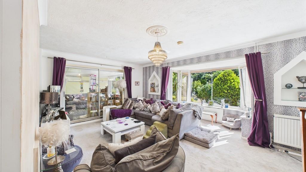 Bay window to rear, TV point, telephone point, patio sliding doors to conservatory, feature fireplace, stairs to first floor.