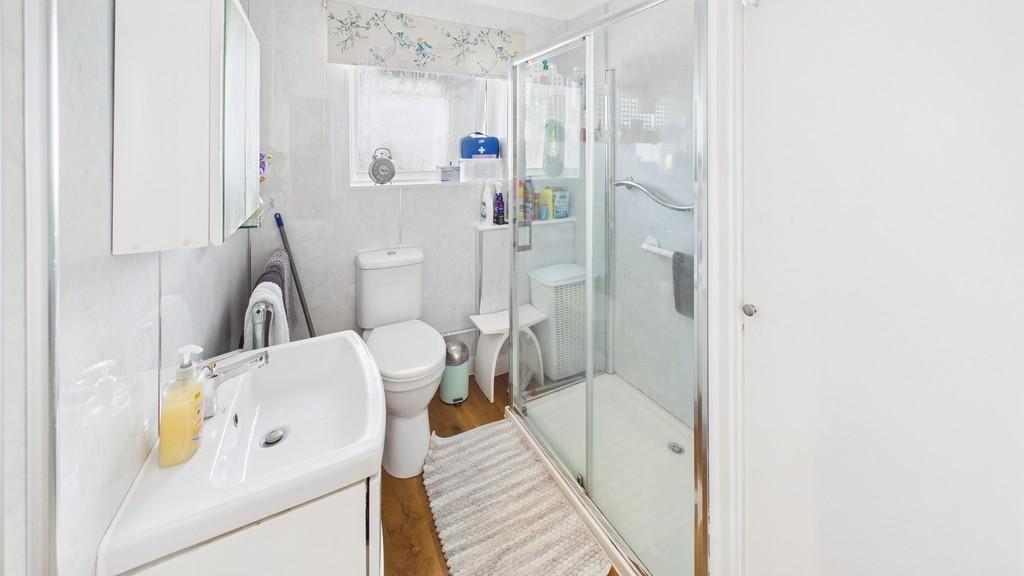 SHOWER ROOM: Low level WC, wash hand basin with two drawers under, shower cubicle, mermaid splashbacks, cupboard housing shelves, shaver socket.