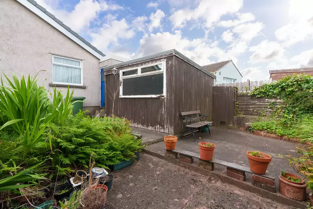 Externally, the property features attractive lawned gardens with established shrubs to the front and side. To the rear, there is a large storage shed, perfect for gardening equipment or additional storage needs. An attached garage offers further storage space.