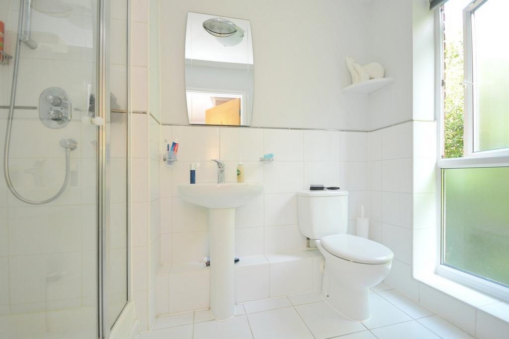 En-Suite - A three piece fitted en-suite shower room comprising of a low-level WC, a wash hand basin, a shower enclosure with glass screen doors, tiled flooring, and tiled walls, and an obscure double glazed window.