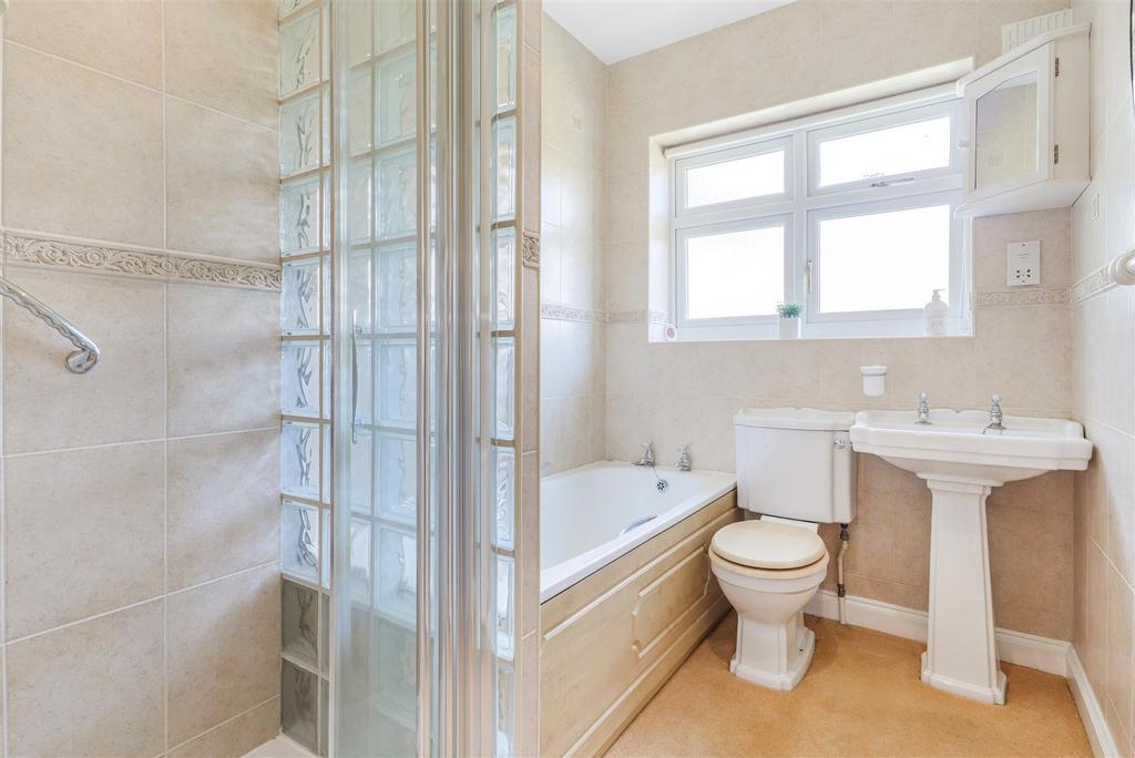 Bathroom - The bathroom features a four-piece white suite, which includes a low-level WC, a pedestal wash basin, and ceramic tiled walls. It is equipped with a radiator, a wall light, and a shaver point, as well as LED ceiling downlights. There is a separate walk-in shower enclosure with a Mira Sport electric shower, a bi-folding shower screen, and a stylish glass block wall. Additionally, the airing cupboard houses the hot water cylinder with slatted shelving, an immersion heater, and a control clock, along with another radiator for added comfort.