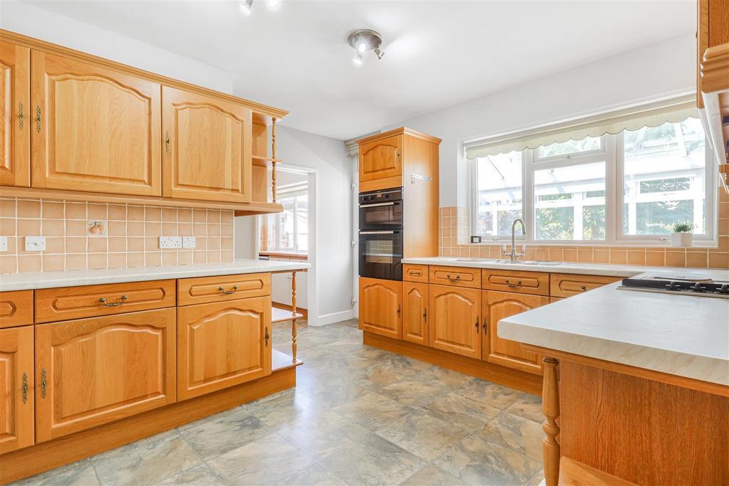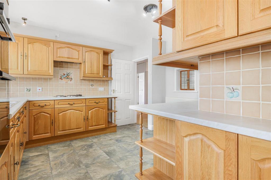 Breakfast Kitchen - This kitchen is thoughtfully designed with a range of oak-fronted base and wall units, complemented by corner display shelving. It features marble-effect rounded work surfaces with ceramic tiled splashbacks, a one-and-a-half bowl stainless steel sink with a chrome mixer tap, and an integrated Indesit eye-level fan-assisted oven with a separate grill. There’s also a four-ring electric hob with a concealed illuminated extractor hood, an integrated under-counter fridge, and two ceiling spotlights. Natural light fills the space through a double-glazed window leading to the conservatory and a uPVC door. Additional highlights include a radiator, click laminate flooring, and space for a small breakfast table, along with a door leading to the adjoining area.