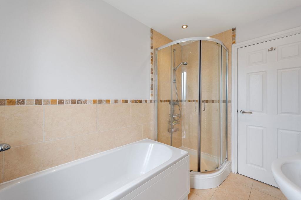 This beautifully appointed four-piece bathroom is a serene retreat, featuring a freestanding bath, separate shower enclosure, wash basin, and WC. Tasteful cream tiling on the walls and fully tiled flooring combine practicality with elegant design.