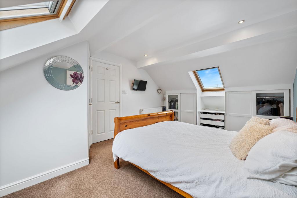 The master suite of the home, this impressive third-floor bedroom is bright and spacious with two skylight windows, one front and the other rear facing, fitted carpets, stylish spotlights, and a wall-mounted radiator. Just off the bedroom is further space which features a WC, wash hand basin and a chrome ladder radiator, making it a perfect sanctuary for guests or as a luxurious master suite.