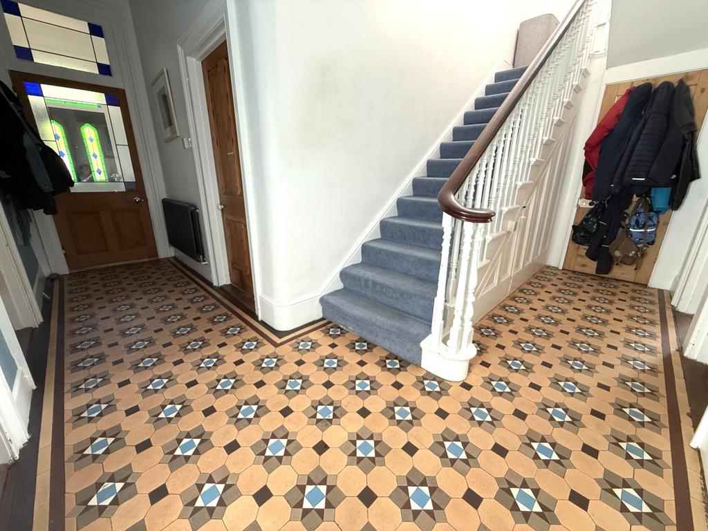 Staircase rising to first floor with useful under stairs storage cupboard, which houses the electric meter, electric trip switch fuse box and solar panel controls. Attractive Mosaic tiled flooring. Radiator. Ornate coving. Ceiling rose. Stripped and sealed wooden doors leading to 3 receptions, kitchen, shower room and: