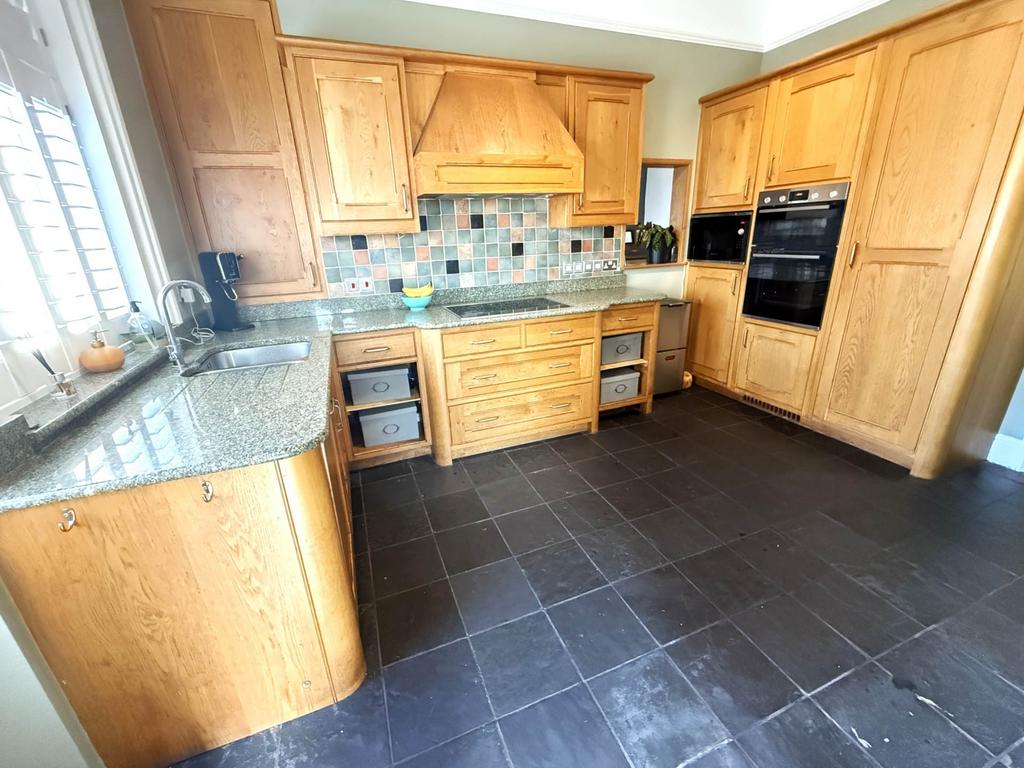 uPVC double glazed window to rear with fitted window shutters. Range of wooden cupboard and drawer storage units with marble work surfaces and matching up stands. Stainless steel one and a half bowl sink with mixer tap and work top drainer. Built in 5 ring induction hub with filter hood above and eye level double electric oven and grill opposite. Integrated microwave and dishwasher. Radiator. Tiled flooring. Picture rail. Open to: