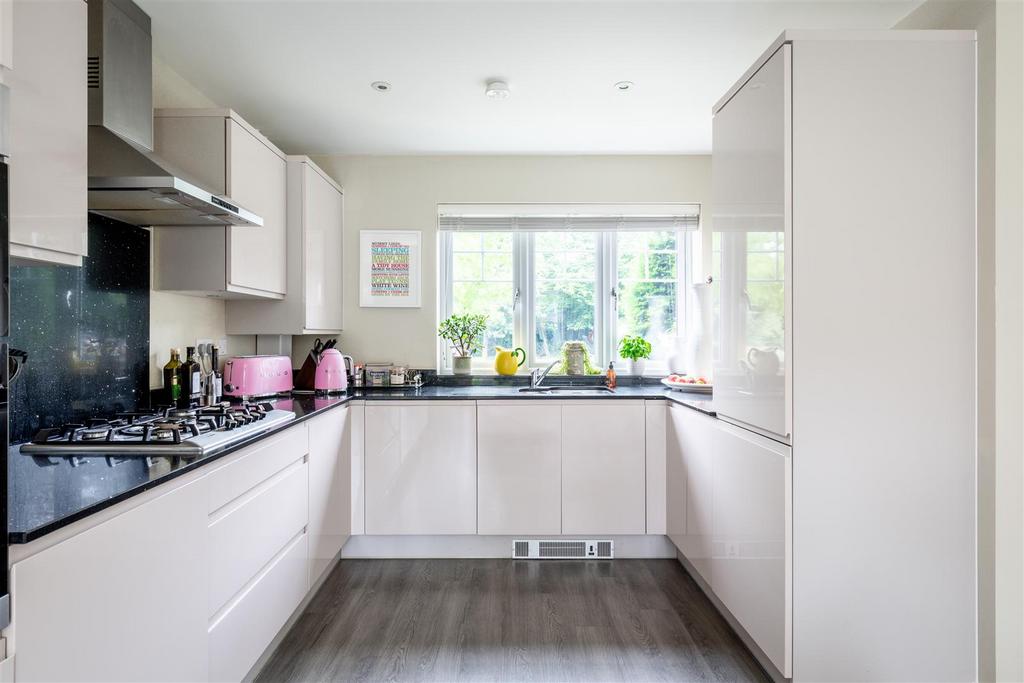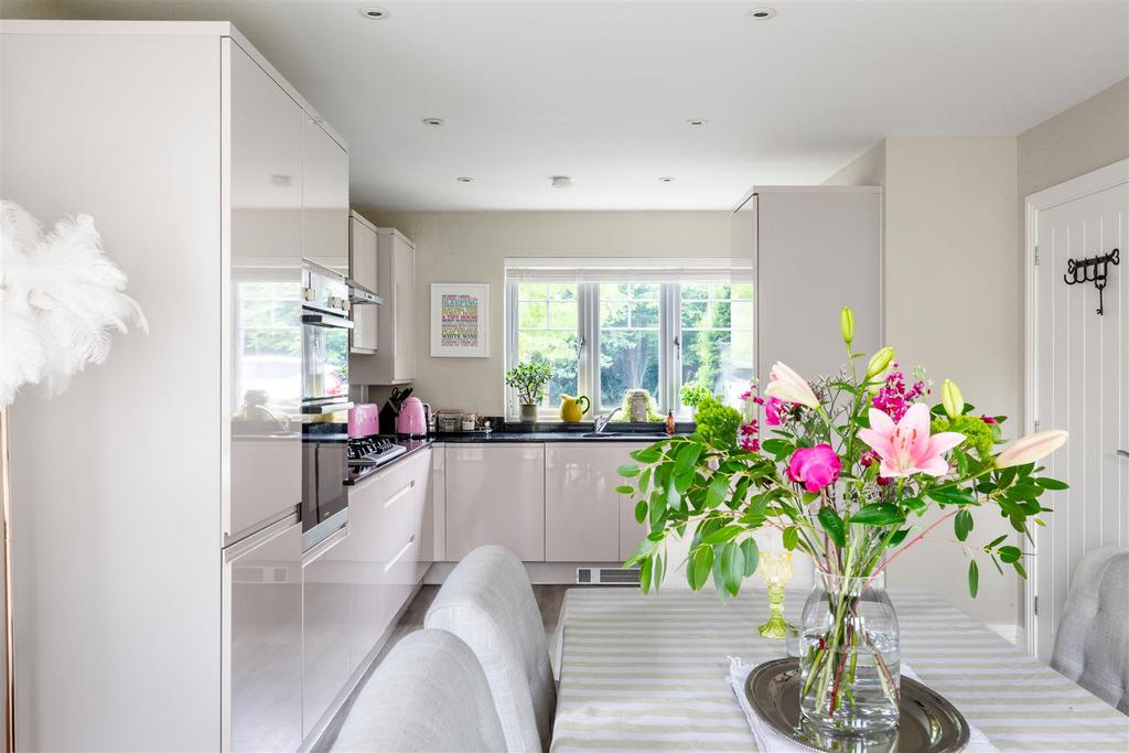 Heart Of The Home... - The heart of any home is the kitchen/diner and this kitchen is a standout feature in a home that blends elegant design with practical functionality. This is a sleek space designed with everyday living and entertaining in mind. The contemporary, handleless units give a streamlined and elegant look, complemented by high-gloss finishes that reflect natural light beautifully. black granite worktops offer a striking contrast, while also providing ample preparation space. The kitchen is equipped with a full range of integrated appliances, including a Bosch double oven, gas hob with stainless steel extractor, and a built-in dishwasher, ensuring everything you need is within easy reach. The large window above the sink not only frames views of the garden but also allows natural light to pour in. French doors open out from the dining area to the garden to give the “inside-outside” living space most of us desire.