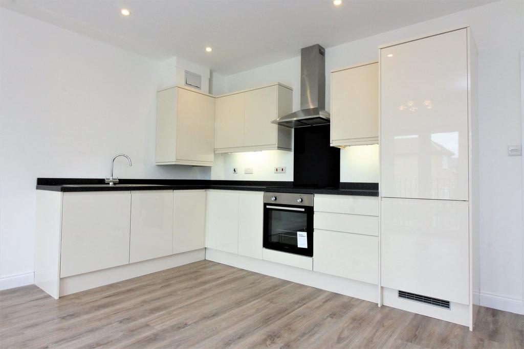 A modern open plan living space with double glazed French doors opening out to a Juliet balcony. Television point. Radiator. The kitchen area is well fitted and comprises a comprehensive range of eye and base level units with ample work surfaces. Built-in ceramic hob, electric oven and extractor hood. Integrated fridge/freezer, washer/dryer and dishwasher. Inset ceiling lights. Luxury vinyl tiled flooring.