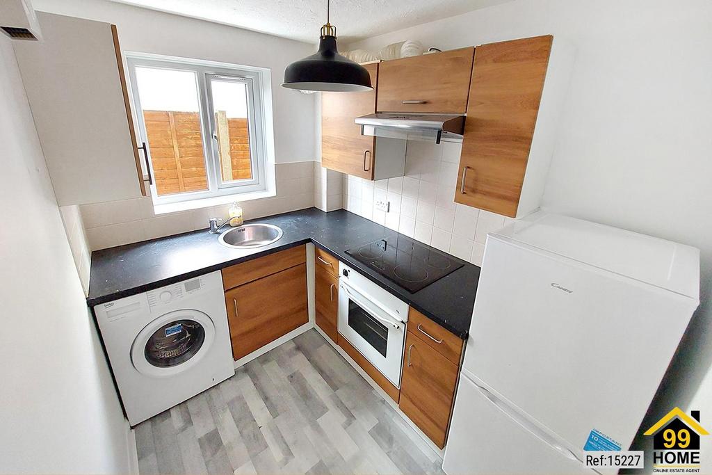 Brand new double glazed window. Recently refurbished and plentiful wall and base units, work surfaces, splash back tiles. Wall heater. Walls and ceiling just painted to achieve a clean and contemporary look. Includes or space for washing machine, integrated oven and hob, extractor fan and freestanding fridge-freezer. Modern style laminate floor.