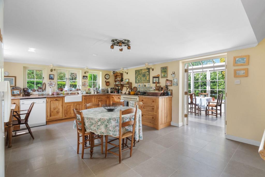 Beyond the sitting area, the dining space flows effortlessly into a welcoming, farmhouse-style kitchen — a room clearly designed to be lived in and loved. Fitted with bespoke Elm cabinetry, a butler sink and range cooker, it's full of rustic appeal, while triple-aspect windows frame leafy green views of the gardens. From here, French doors open through to the stunning garden room/conservatory a bright and airy space with a glazed roof and wraparound windows that create a truly immersive connection with the outdoors. Ideal as a breakfast room, studio or place to unwind with a book in the sunshine. Tucked behind the kitchen, a practical utility/boot room provides excellent space for laundry and storage, with a door leading out to the rear garden.