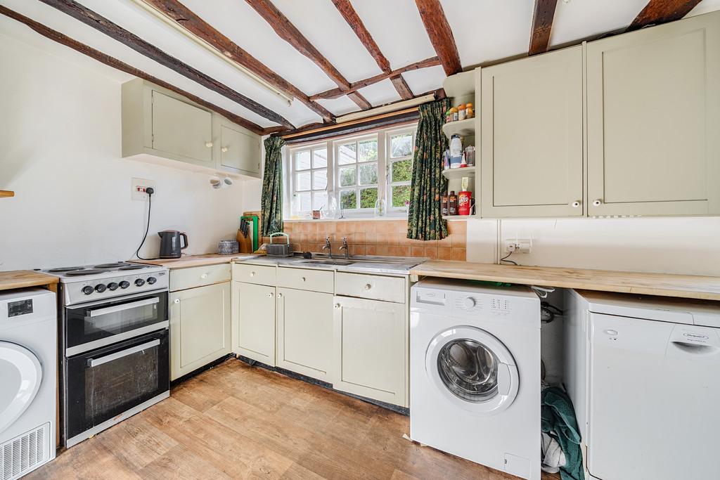 KITCHEN 15' 11" x 7' 6" (4.85m x 2.29m) Stainless steel single drainer sink unit with drawers and cupboards under, range of wall and base units, space and plumbing for washing machine, exposed ceiling beams, door to conservatory.