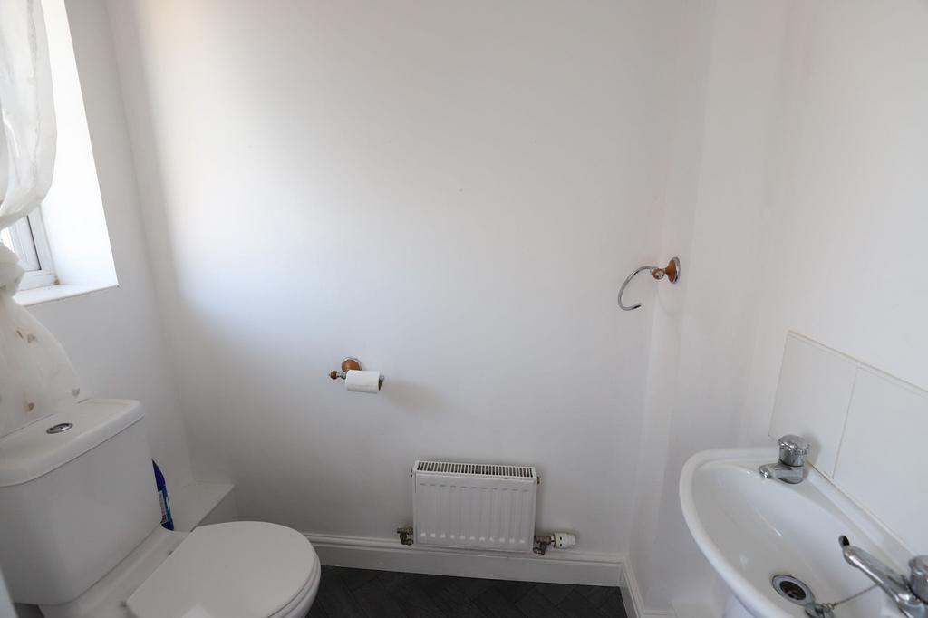 uPVC double glazed patterned window. Ceiling light. High level consumer unit. Two piece suite in white comprising: wash hand basin with tiled splashback and wc.