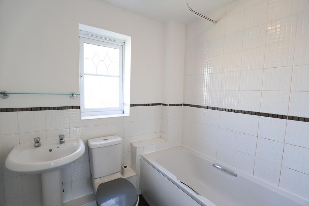uPVC double glazed patterned window. Ceiling light. Extractor fan. Central heating radiator. Three piece suite in white comprising bath with wall mounted shower, wash hand basin and wc. Part tiled to two walls.