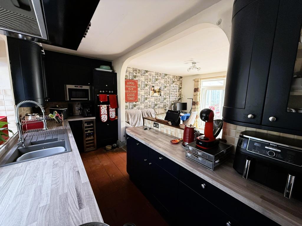 Being open plan to the dining room and having quality tiled floor, recently fitted base and wall units with integral electric double oven, microwave and dishwasher, 1½ A bowl and single drainer sink unit with flexible mixer tap over, electric and gas cooker points with filter hood over, glass fronted display cabinet, under stairs storage cupboard and further pantry cupboard, door returning to the living room and door through to:
