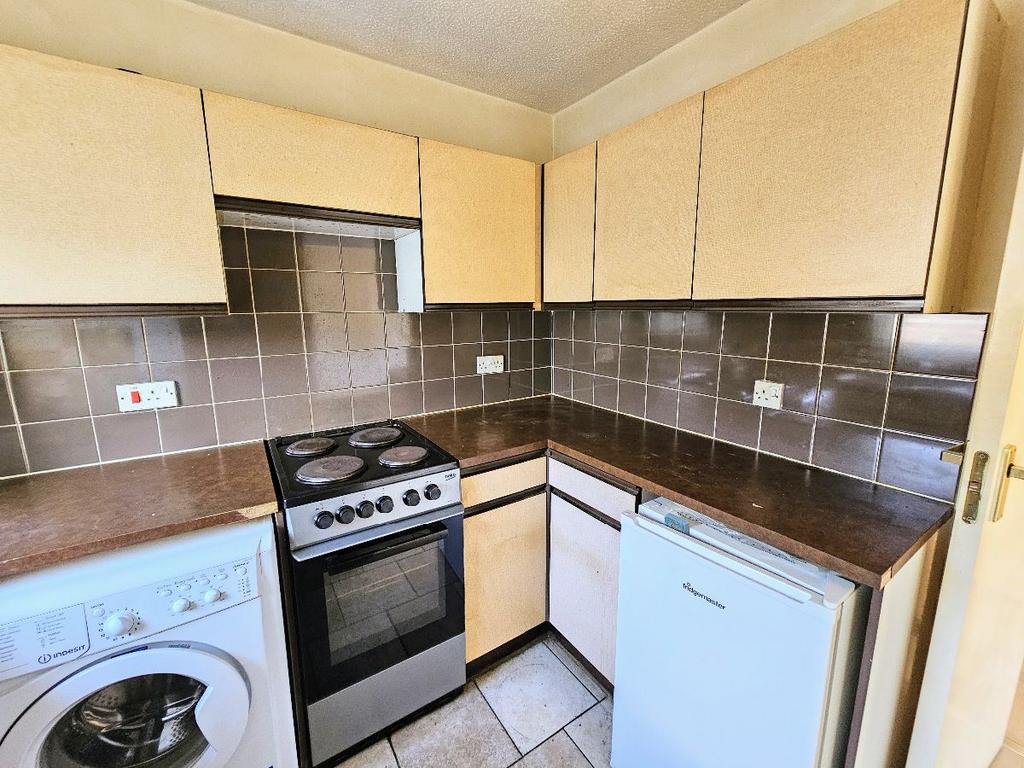 Accessed via a secure communal entrance, the apartment offers an entrance hallway leading into the lounge. The separate kitchen comes equipped with undercounter white goods, providing a practical space for everyday living. The double bedroom benefits from two pine wardrobes which are included in the sale, while the bathroom features a shower fitting over the bath. Double-glazed windows and electric heating service the property throughout, adding to the overall comfort.