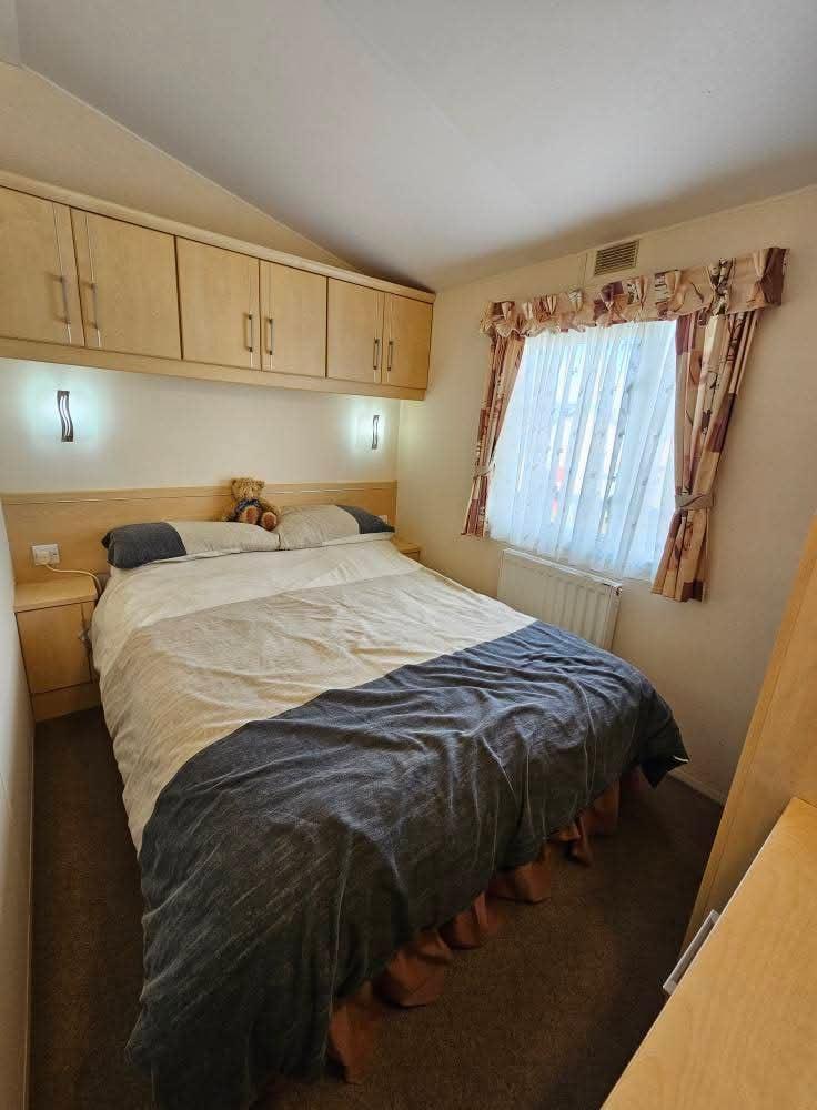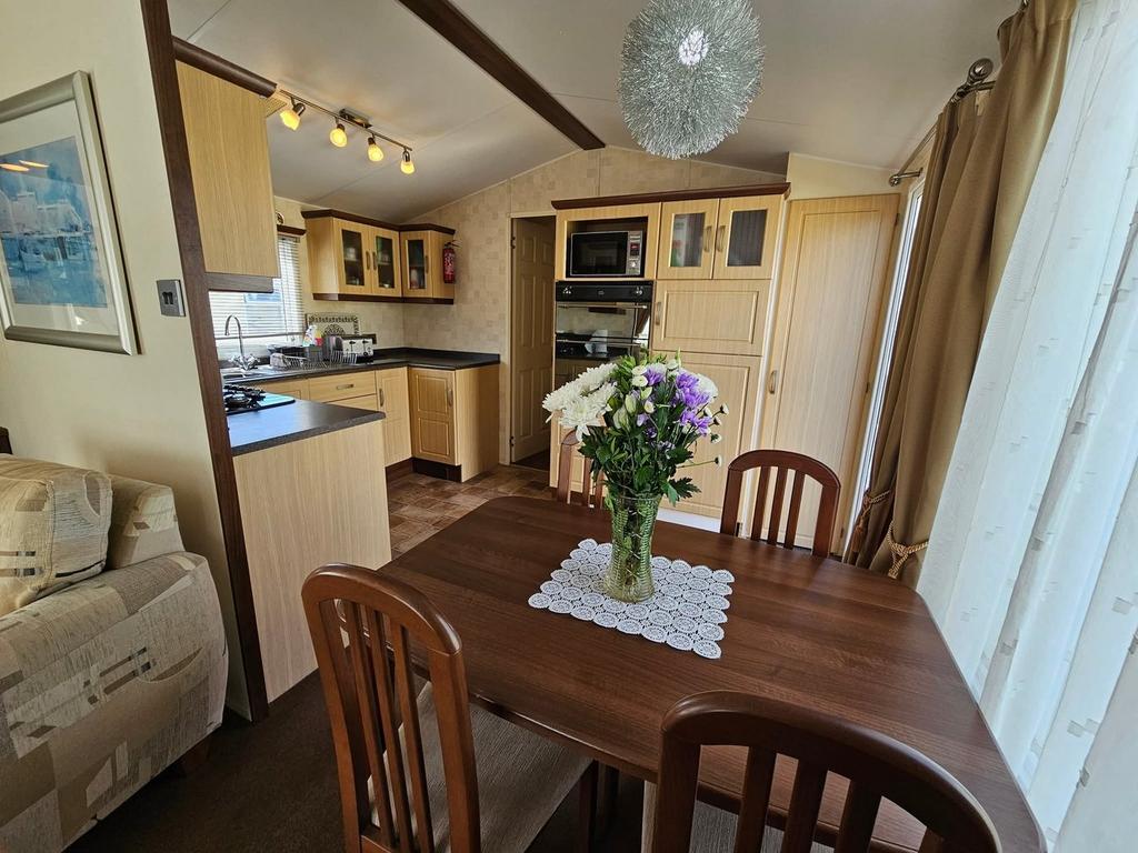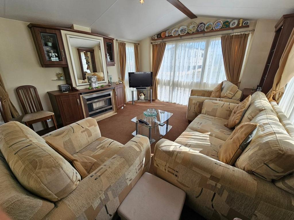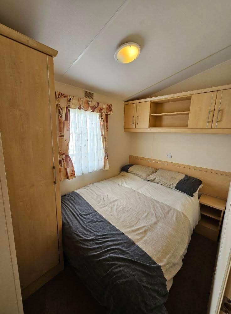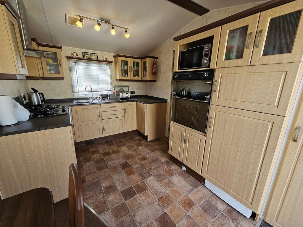 Under the window there a TV stand and cupboard space, it’s in a great position for anyone in the lounge and you can sit together and enjoy a favourite movie or TV series. There is also a gas fire with surround and mantelpiece and shelving which is a great space for personalising your holiday home and making it your own.