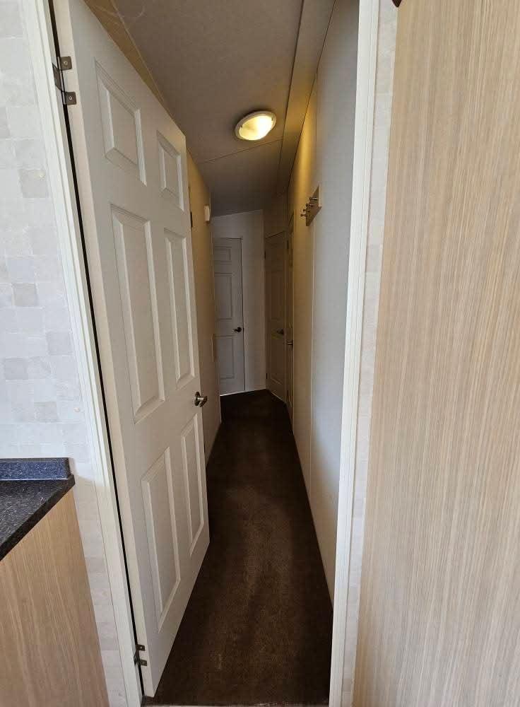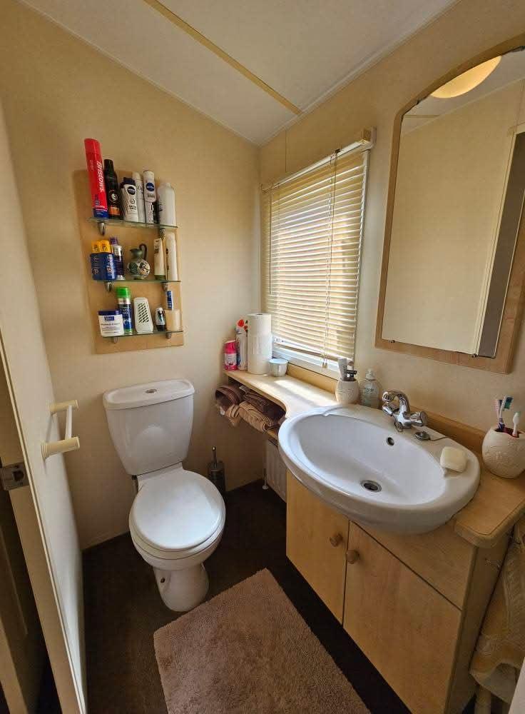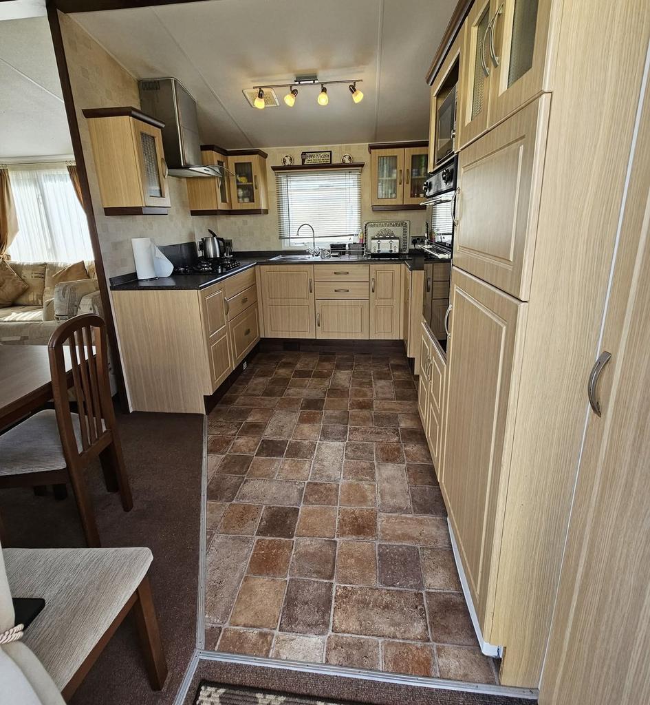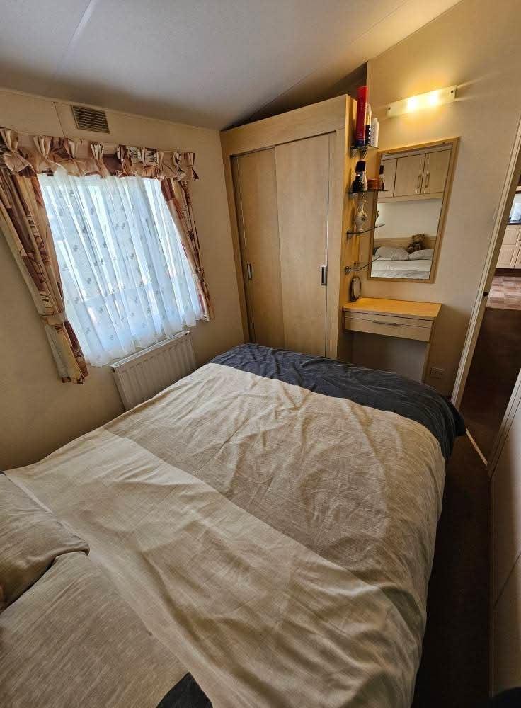Under the window there a TV stand and cupboard space, it’s in a great position for anyone in the lounge and you can sit together and enjoy a favourite movie or TV series. There is also a gas fire with surround and mantelpiece and shelving which is a great space for personalising your holiday home and making it your own.