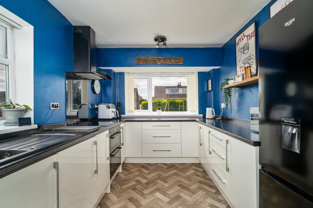 A good range of base and wall mounted units, work surfaces with matching upstands, inset sink unit with mixer tap, built in double electric oven, four ring ceramic hob, glass splashback, chimney style extractor hood, integrated washing machine, a central heating radiator, windows to the front and side elevations and a door leading out to the side.