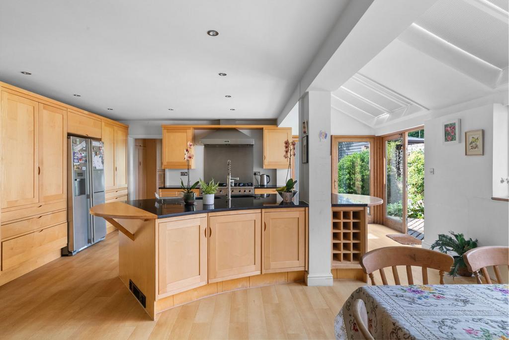 A welcoming entrance hall provides access to the principal accommodation, with a staircase rising to the first floor and a cloakroom discreetly positioned to one side. The sitting room enjoys a dual aspect to the front, featuring three windows that allow an abundance of natural light. Character is provided by exposed ceiling timbers and a natural brick fireplace housing a wood-burning stove. At the heart of the home lies a particularly impressive kitchen/family room, centrally situated and thoughtfully designed for modern living. It is fitted with an extensive range of maple wood cabinets, complemented by granite work surfaces, a breakfast bar, and provision for appliances. A partly vaulted glazed roof sits above the breakfast area and doors opening to the inner courtyard garden, allowing light to pour into the space and enhancing the connection with the outdoors.
