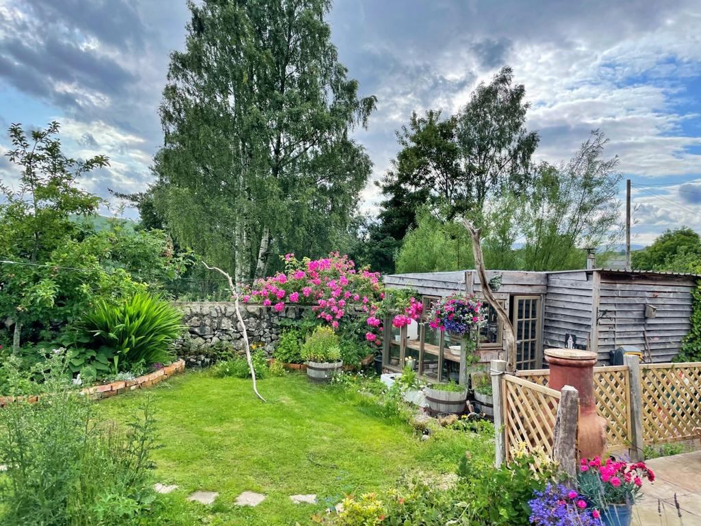 Driveway to the side of the property leading to the rear. Well-stocked colourful wildflower garden with areas laid to lawn, raised vegetable beds and paved pathways. The garden is surrounded by an established hedge giving privacy to the house and garden. Garage and large workshop area with Swedish style masonry stove; attached work room ideal as a hobby room or office and south-facing wooden framed glasshouse. Decked seating areas are located at the rear of the property with peaceful views over the garden and Galloway hills beyond.