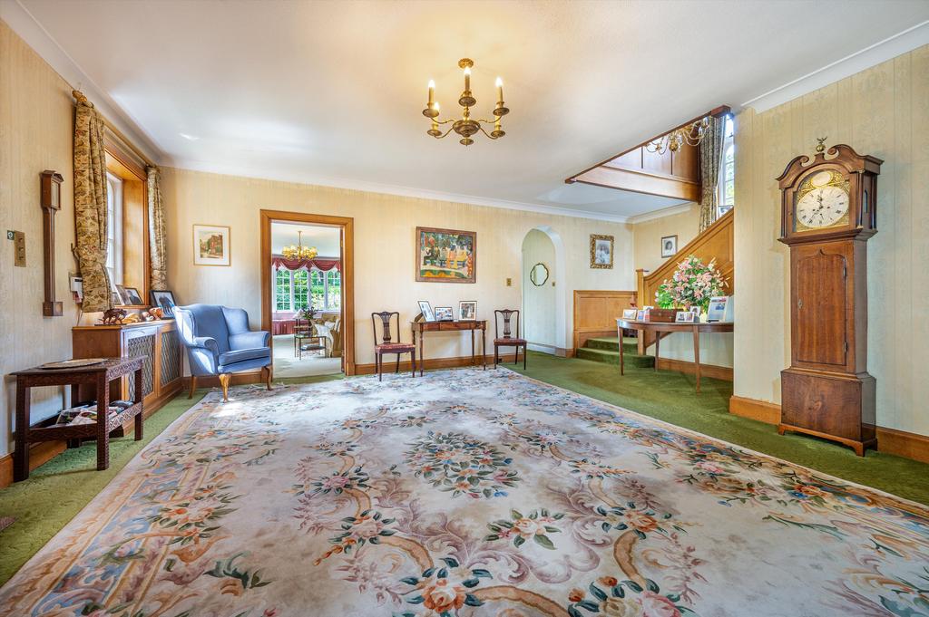 Approached across the common the drive leads to the front of the house and the garaging to the side. The gardens wrap around the house with delightful areas of lawn to the front, side and rear interspersed with colourful floral beds and borders along with impressive, specimen trees. There is a dedicated kitchen garden with soft fruit cages and beyond the formal lawns a hard tennis court (now in need of resurfacing).