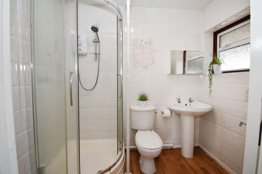 Compact yet well-appointed, the shower room (5'4" x 7'5" / 1.64m x 2.28m) offers tiled walls, a walk-in cubicle, WC, wash basin, and a window to the side—balancing function and style for everyday ease.