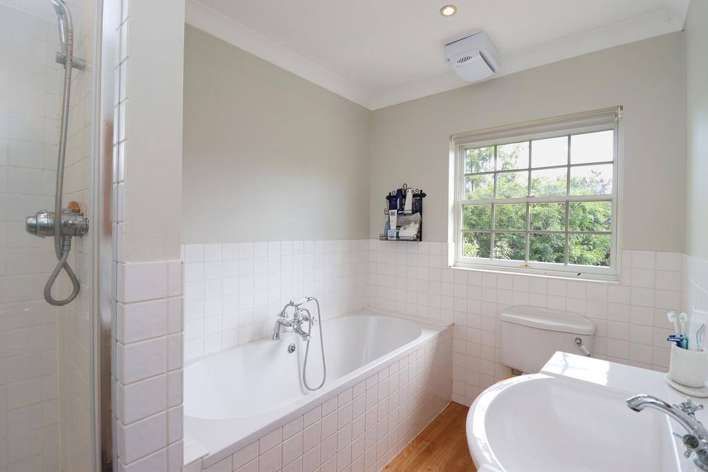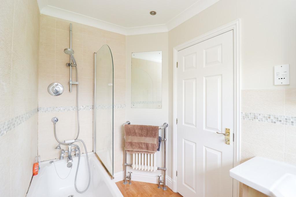 FAMILY BATHROOM 9'00 x 5'03 window to the rear (East), the bathroom has contemporary tiling to the side and rear over the inset panel bath with shower over, wash basin to the side over vanity unit, w/c and heated towel rail. Recessed ceiling lights and extractor fan.