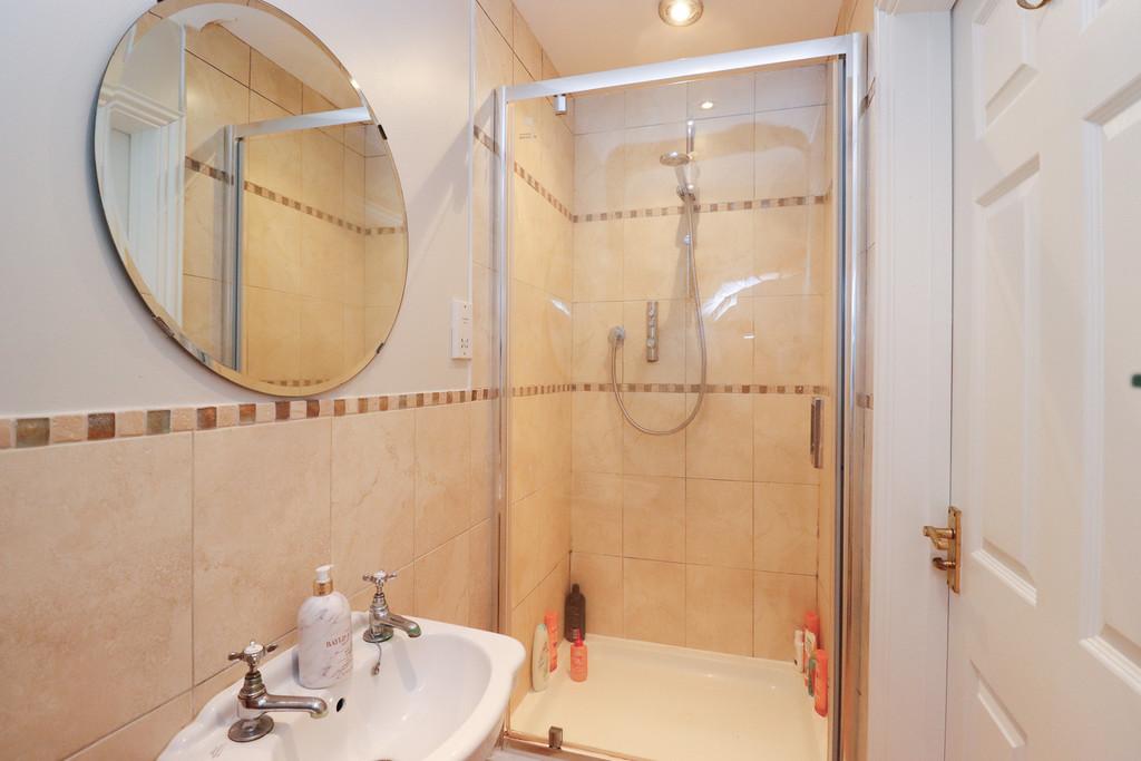 EN-SUITE 8'07 x 3'02 wood effect flooring and tiles to waist height, fully tiled oversize shower to the, wash basin and w/c, recessed ceiling lights and extractor fan.