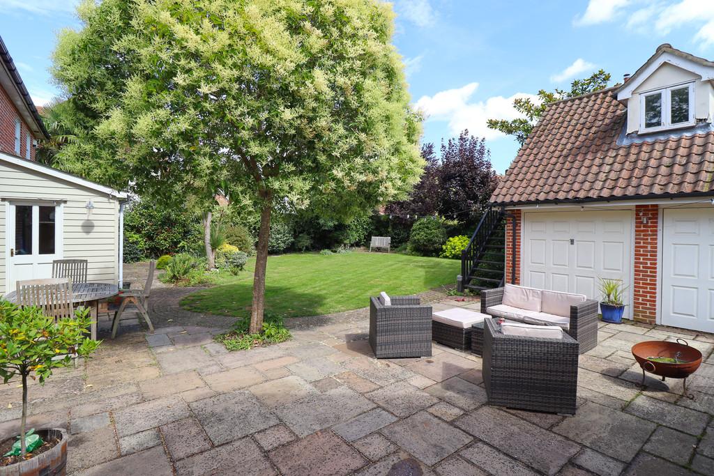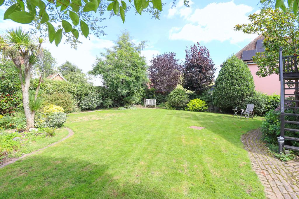 REAR GARDEN taking in an Easterly aspect but open to the South at the side this well presented garden benefits from an abundance of terraced spaces with shade to be found on one or another throughout the day. The central area of lawn is flanked by beds containing mature shrubs and plants, further mature specimen trees populate the edges of the garden providing further shade. Ahead of the cart lodge an area of terrace has been created to make best use of the space, double gates to the driveway remain should vehicular access be needed to the garages.