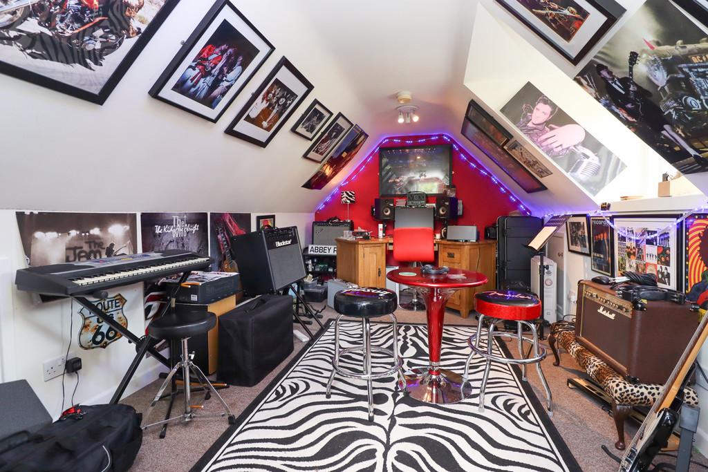 MUSIC ROOM/OFFICE 16'08 x 9'05 part glazed door from the stairs, window to the front, power and light are connected to this useful insulated space away from the main house.