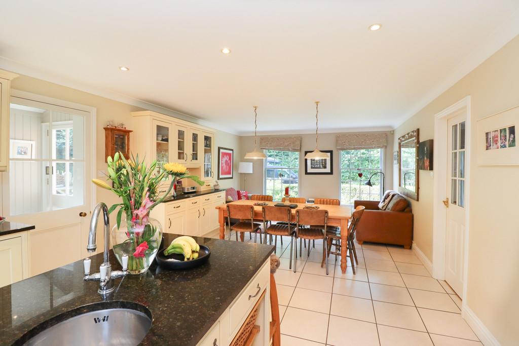 KITCHEN DINING ROOM 26'02 x 13'04 dual aspect with sliding sash windows to the front and rear filling the room with light, tiled floor. Currently set out with a seating area following by dining table and then into the kitchen space. The kitchen comprises a range of shaker style wall and base units to three sides offering extensive storage and practical space, black granite work surface wraps around the kitchen with inset butler sink and drainage. Central island unit provides further storage under a granite work surface with an under-mount preparation sink. This space is well planned and appointed to serve as a core space to the busy family home. Doors to the: