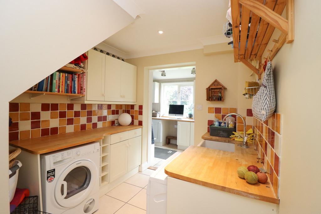 UTILITY ROOM 10'07 x 7'07 range of wall and base units to two sides under an oak work surface with inset butler sink and tiled splash backs, large storage cupboard, the space is open plan into the: