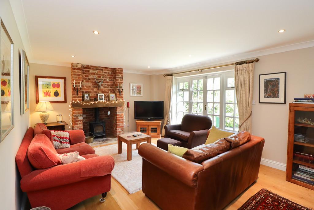 SITTING ROOM 17'11 x 12'08 panel glazed French doors onto the terrace and rear garden, the focal point of the room is a brick fireplace with oak mantle and inset log burner over a light brick hearth, recessed ceiling lights complete this very well appointed space.
