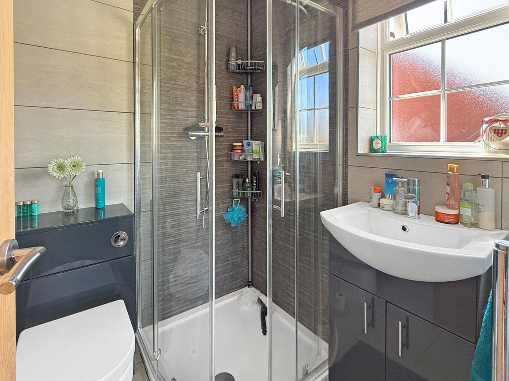 The modern family bathroom is designed with both form and function—featuring a sleek suite and shower over the bath, with a downstairs WC for added convenience.