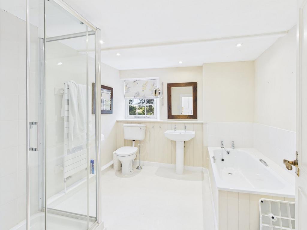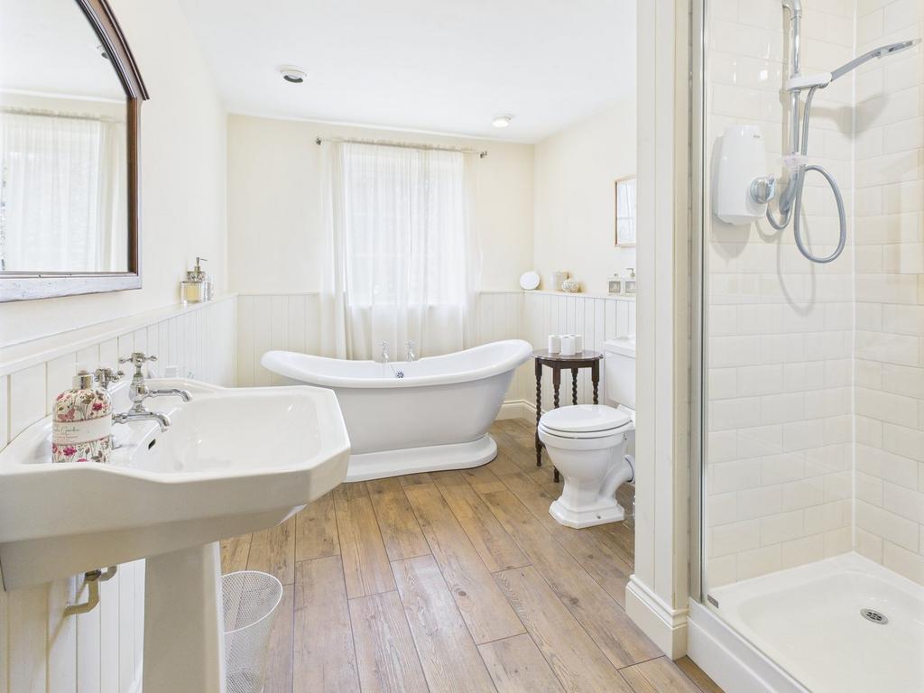 7' 2" x 13' 10" (2.18m x 4.22m) Window. Roll top bath. Shower cubicle. Wash hand basin. W.C. Spot lights. Heated towel rail