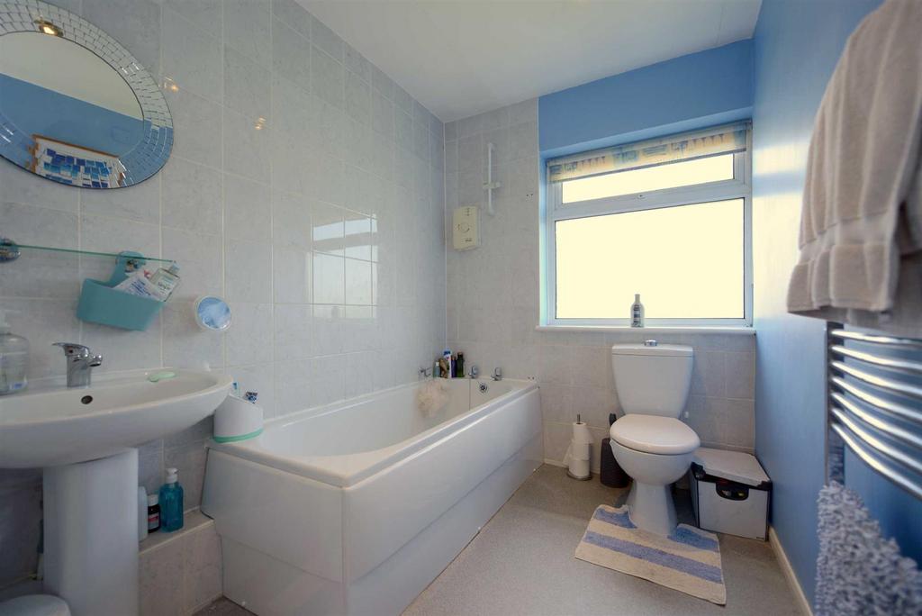 Bathroom - Having a re-fitted white suite comprising: panelled bath with pedestal wash hand basin, low flush WC, vinyl floor covering, part tiled to walls, recessed spotlights to ceiling, upvc double glazed window to rear, heated chrome style towel rail.