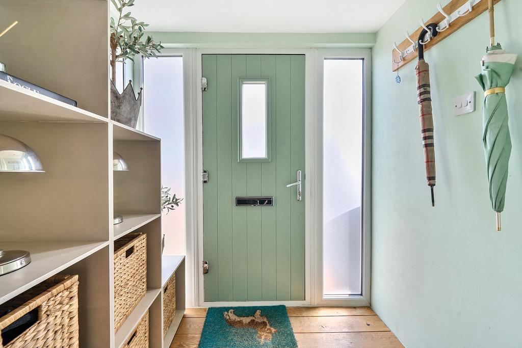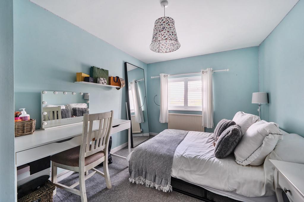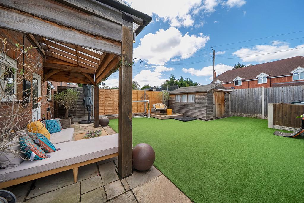 The rear garden provides an attractive covered area with paving leading on to an astroturf garden being enclosed and a useful timber shed with power and lighting.