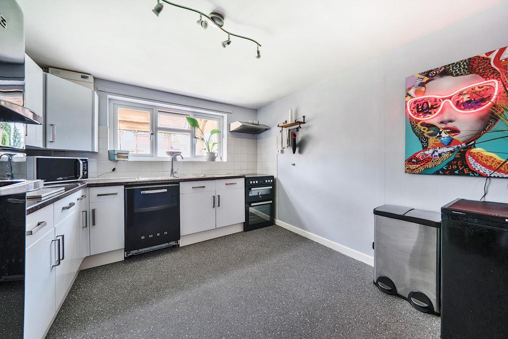Breakfast kitchen with a range of wall and floor cabinets, Beko electric freestanding cooker, plumbing for dishwasher and wall tiling.