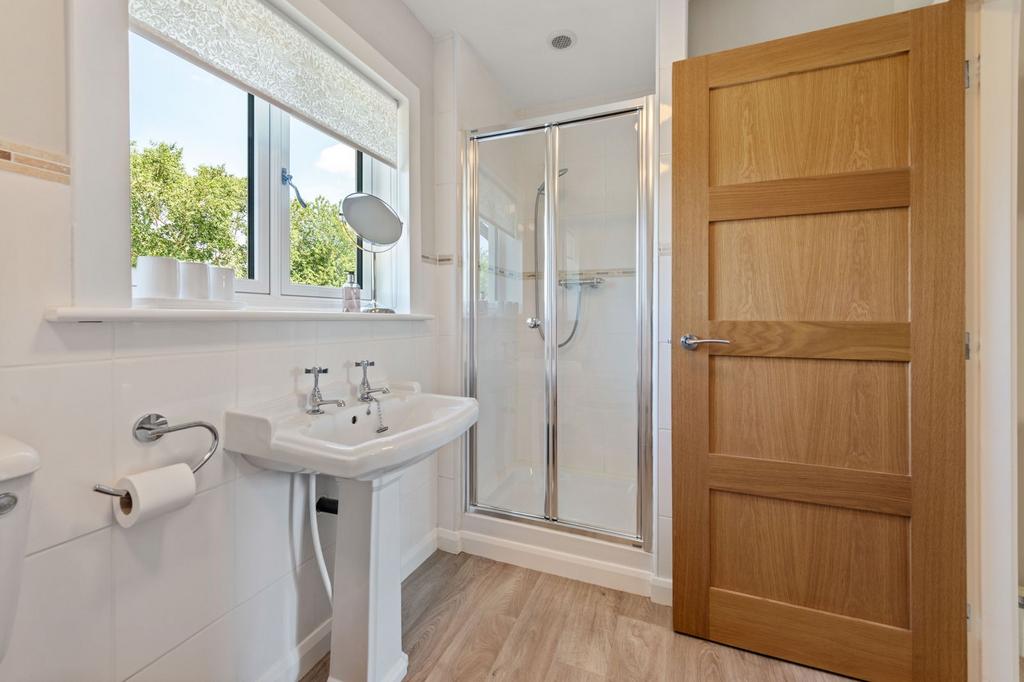 FOUR-PIECE FAMILY BATHROOM measuring 12’2” x 5’9” - Having two UPVC double-glazed windows to the rear aspect, chrome heated towel radiator, integrated extractor fan and a four piece white suite comprising of a low level WC, handwash basin, panel bath with mixer tap and shower attachment and a fully tiled shower cubicle with folding glazed shower screen and mains fed shower.