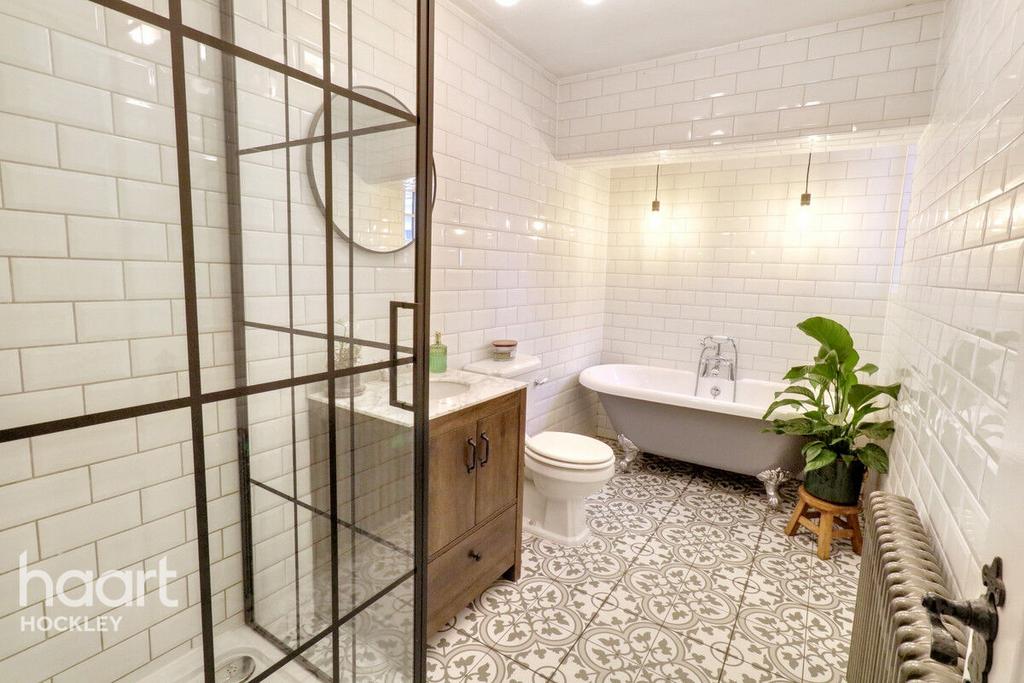 Four piece suite comprising freestanding roll top bath with mixer tap and hand held attachment, shower with rainfall showerhead over and hand held attachment, wash hand basin set in vanity unit with mixer tap and low level w.c, tiled flooring, tiled walls, traditional radiator, double glazed obscure window to rear.