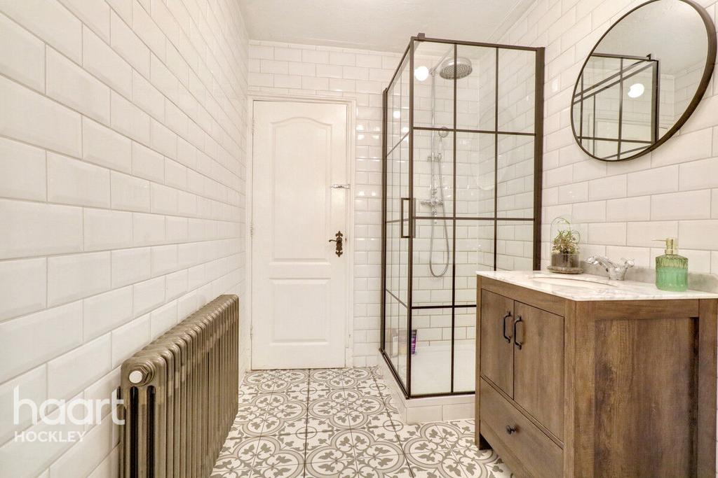 Three piece suite comprising double walk-in shower with rainfall showerhead over and hand held attachment, twin wash hand basins with mixer taps set in vanity unit and low level w.c, tiled flooring, part tiled walls, traditional radiator with chrome towel warmer above, double glazed obscure window to rear.