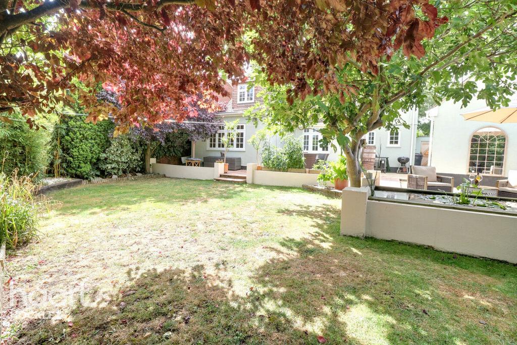 Secluded garden with paved patio, steps down to lawn with shrub and tree borders, raised pond, further seating area to side, access to garage, side gated access to front.