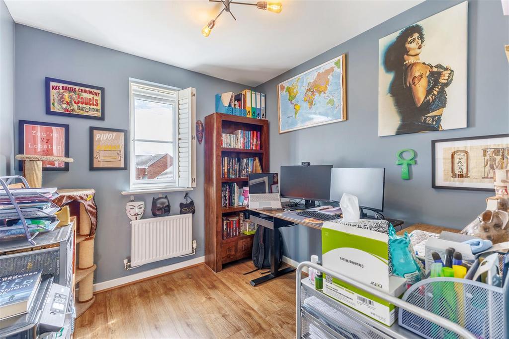 Upstairs, the first floor features four bedrooms, including a principal bedroom with built-in wardrobes and en-suite shower room. There is a well-appointed family bathroom and a fourth bedroom currently used as a study.